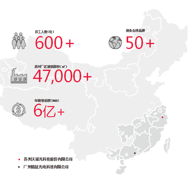 蘇州天祿光科技股份有限公司成立于2010年11月,主要從事生產、 銷售、研發光電導光板及相關零組件,2021年主營業務收入超8億元。2013年我司在相城區黃埭鎮委、鎮政府,相城區委、 區政府的大力優惠的招商引資政策上購置了45畝工業用地。并建成工業用房47000平方米,現已正式投入使用。